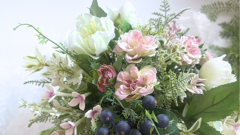 このダークな色が、淡い色合いのアレンジメント全体をきゅっと引き締め、作品に冬のムードを加えています。