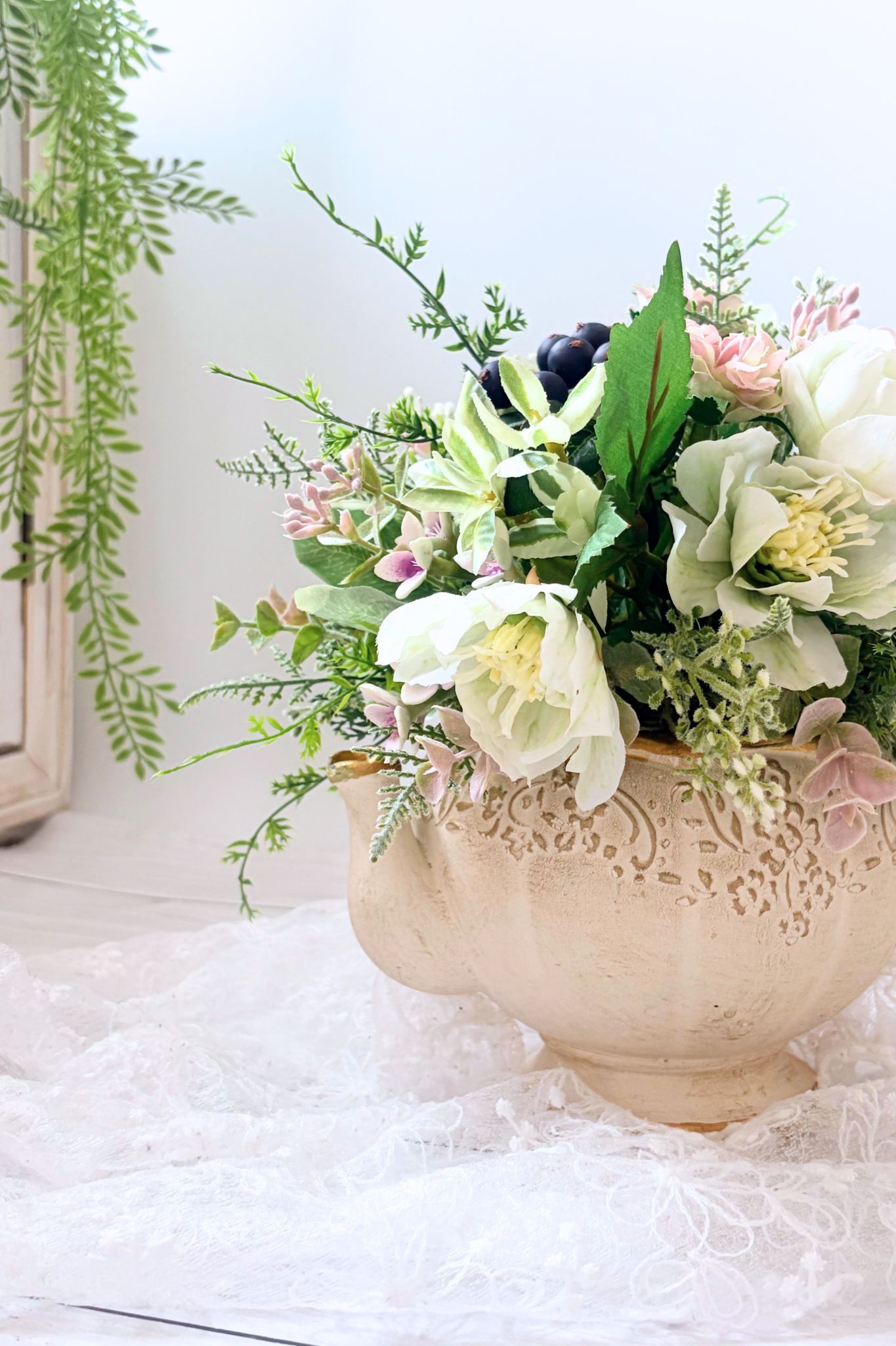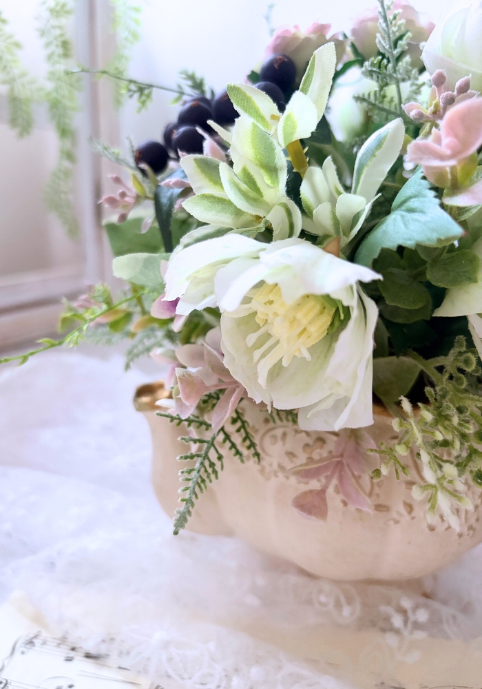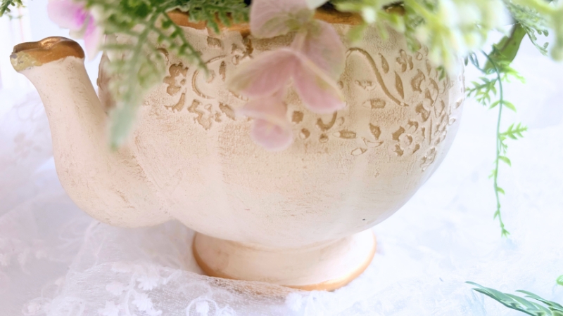 ティーポットの優しいアイボリーの質感が、アレンジメント全体にクラシカルで温かい雰囲気を加えてくれます。