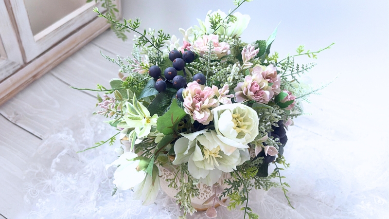 はっきりした色ではなく、淡い色味の花材で、色のトーンを合わせています。