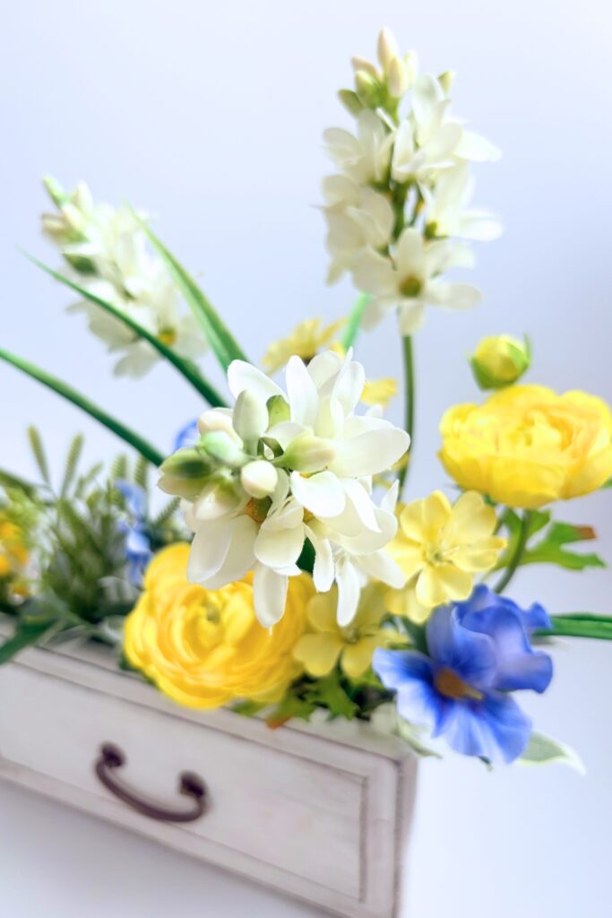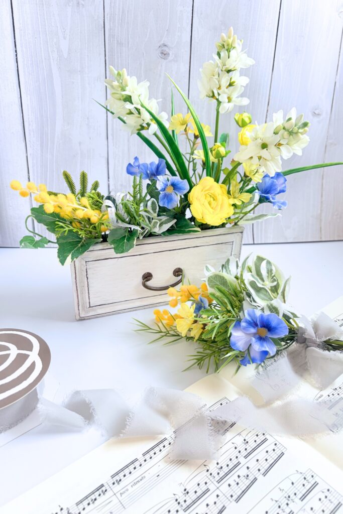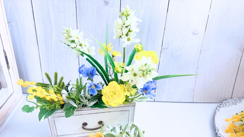 春の喜びが引き出しからそっと、でも力強く溢れるようなイメージでアレンジします。
