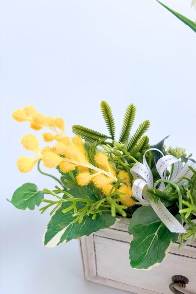アレンジのアクセントとして、また、ミモザの束がそっと添えられているイメージにも見えるリボンの存在。