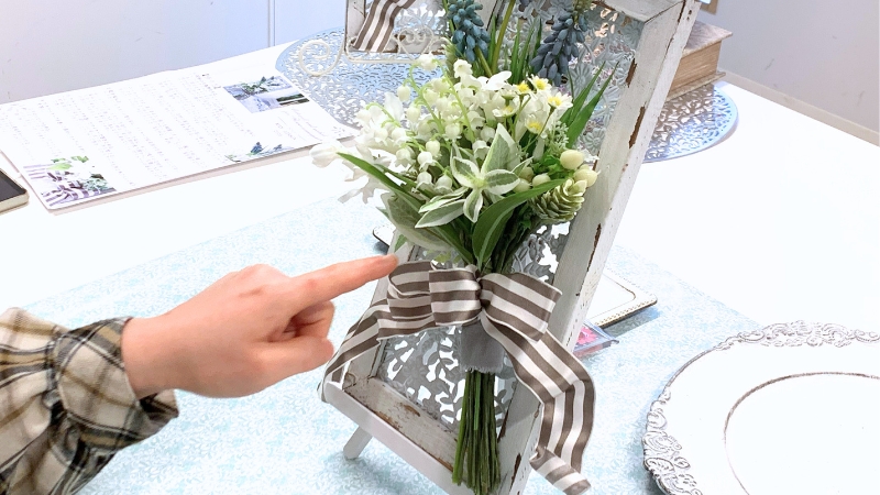 今回のレッスン作品は『スズランとムスカリの爽やかフレームブーケ』。