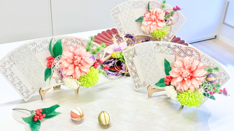 扇型のプレートに映える、モダンで華やかなお正月飾りが完成しました!