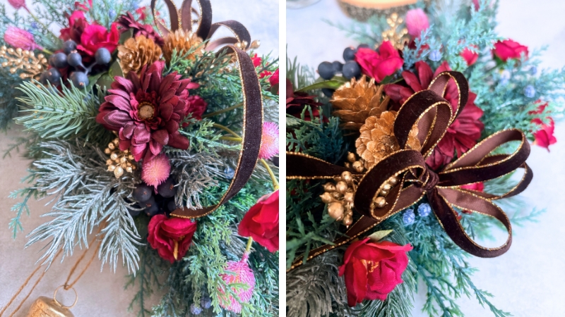 - クリスマスの色合い: クリスマスカラーである赤とグリーンを基調としつつも、色味は落ち着いたトーンでまとめ、大人っぽく洗練された雰囲気に仕上げました。リボンは、ベロアのブラウンを選び、大人の雰囲気に合わせて選んでいます。