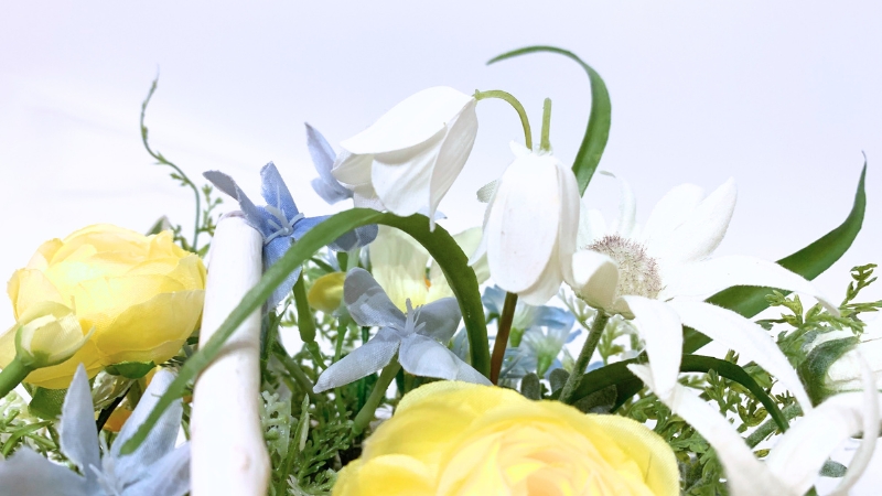 今回は、黄色と水色のお花を中心にウェディングをイメージし、カゴもホワイトカラーを選びました。
