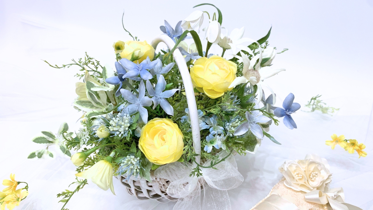 今回は、黄色と水色のお花を中心にウェディングをイメージし、カゴもホワイトカラーを選びました。