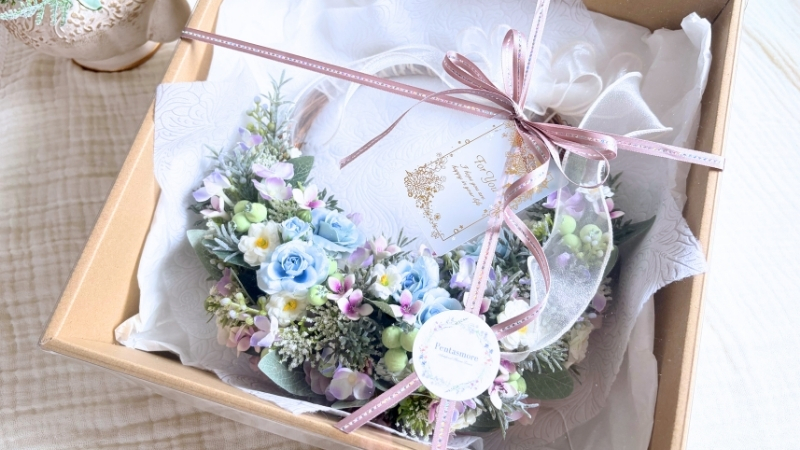 ご依頼主様からは、お相手のイメージカラーとして「パープル、水色、ブルー系」と伺っていましたが、お打ち合わせの中でこんな優しい言葉を添えてくださいました。