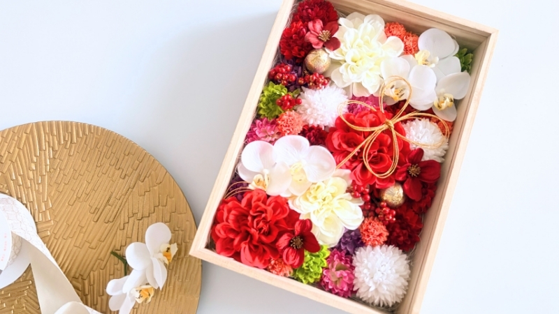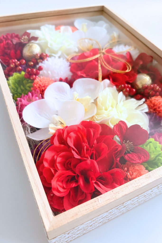 お祝いにふさわしい胡蝶蘭を主役にし、紅白の「お祝いカラー」で仕上げた和風テイストのフレームアレンジです。